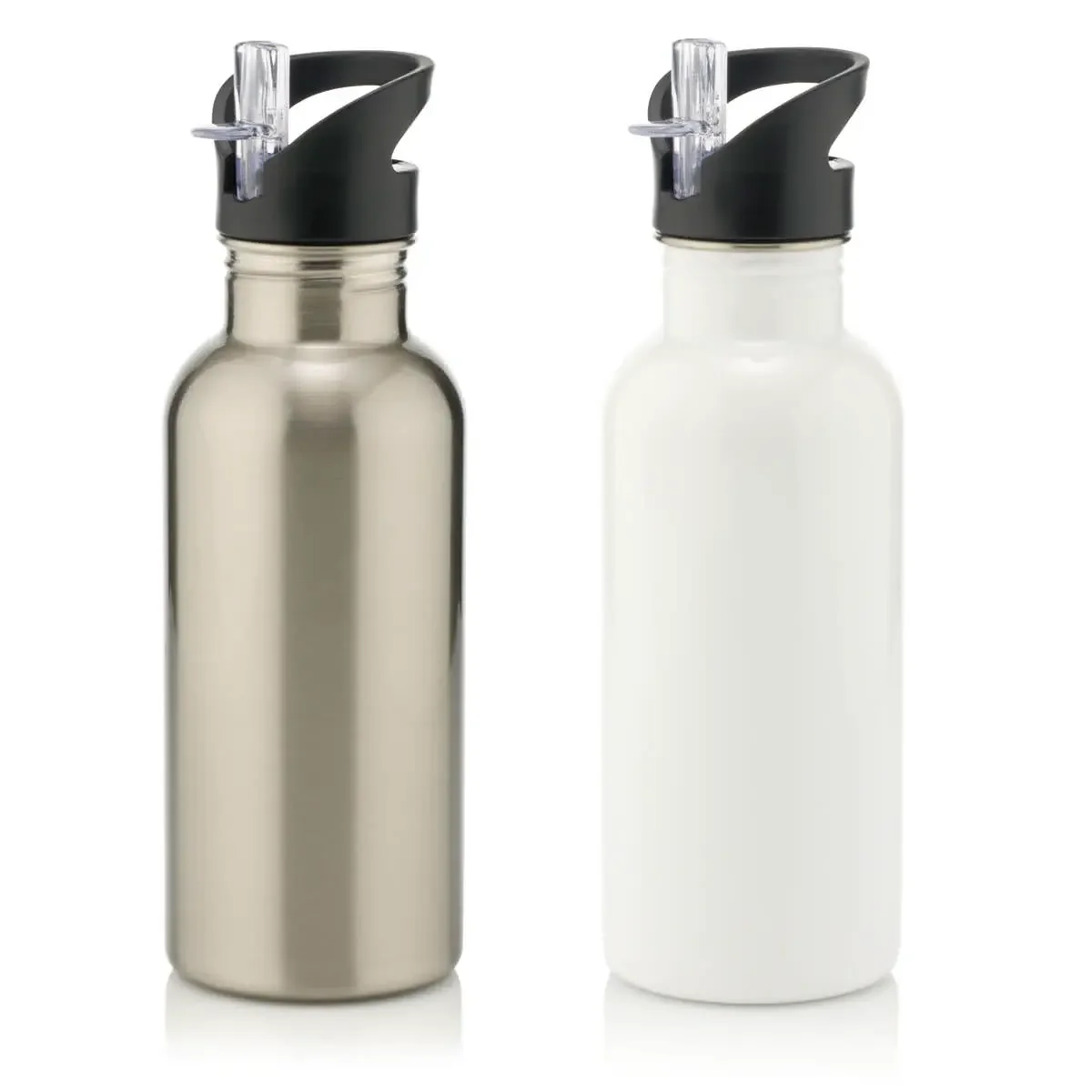 Single walled aluminium 650ml water bottle with white polyester coating for sublimation. Screw top lids with strap are available in 5 colours. 650ml.